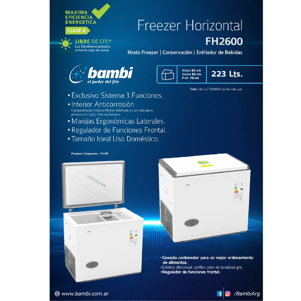 No te pierdas la oportunidad de adquirir el Freezer Horizontal Bambi 223LTS FH2600 y disfruta de la comodidad de conservar tus alimentos y bebidas de manera eficiente. ¡Haz tu pedido ahora!